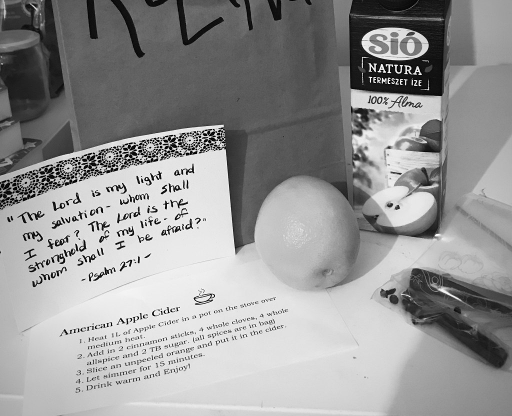 During this Difficult COVID time, we have been unable to open our home as much as we would of liked. Great news, we can show hospitality in so many ways! Gathering up items to make American Apple Cider kits, we put gift bags together to deliver to people at their front door. My daughters helped me to write out verses to include in each bag and we hope that the Love of Christ was extended with each one we delivered.